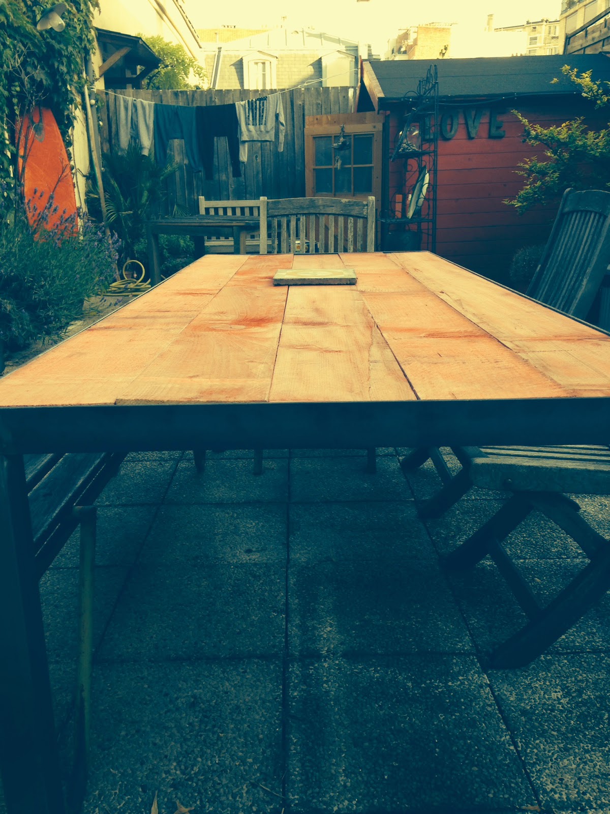 Comme vous le savez j'organise mon vide dressing sur ma terrasse ce samedi 21 juin , jour de la fête de la musique , 1 er jour de l'été , et 17 ans d'amour avec mon amoureux !!! c'est pas rien , .mais bon je ne suis pas là pour vous raconter ma vie , mais un peu quand même , donc il fallait penser à toute l'organisation de cette vente sur la terrasse et là je dis à mon amoureux , il nous faudrait une grande table pour que je pose tous les jeans et autres... Et là , réponse du "ga":